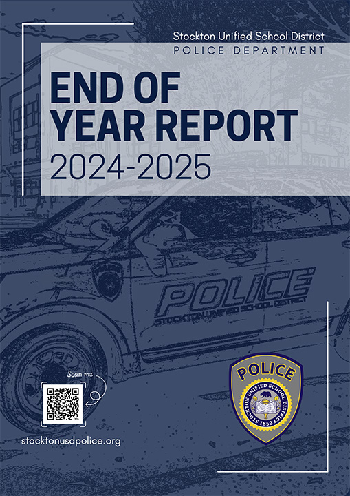 The Stockton Unified School District Police Department’s End of Year Reports provide annual updates on our team, our work, our programs and our community, including statistics on calls for service, the types of offenses reported and disposition of cases.
